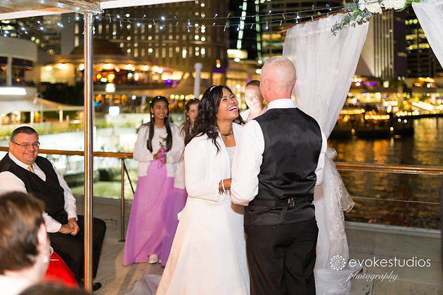 Steve and Kate met overseas, she has 3 children and so does he so they fell in love and decided to become the new age Brady bunch. There intimate wedding was held on the iconic Kookaburra Queen, and what a backdrop for their ceremony, with Natasha Hill helping them tie the knot. All the guest enjoyed watching the brisbane night skyline change around them during the cruise. They had a 1 night honeymoon before back to mum & dad duties.
